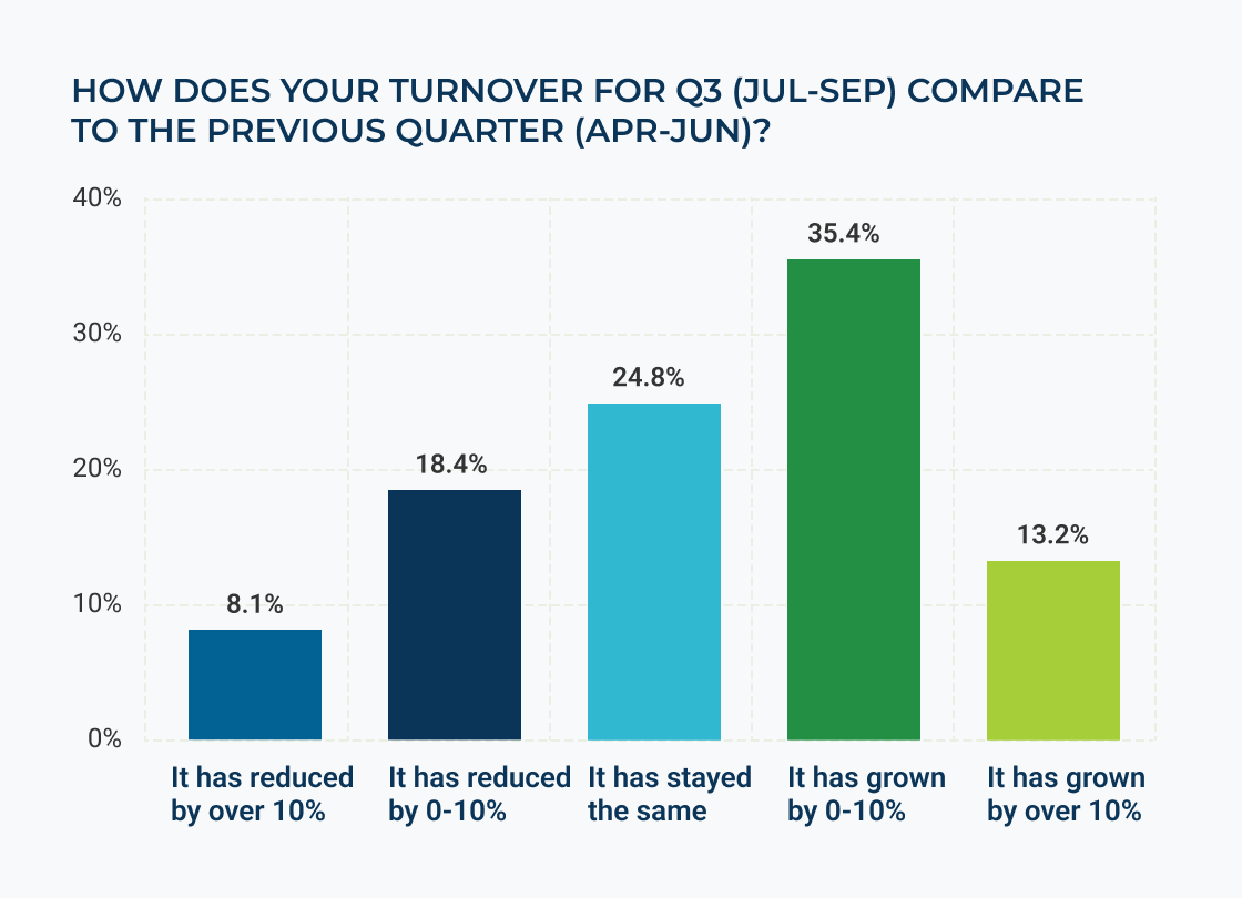 Against this backdrop however, our findings reveal modest improvements in those smaller businesses who are reporting turnover and profit stability and/ or growth, and a corresponding decrease in those who are reporting negative quarter-on-quarter turnover and profit performance.