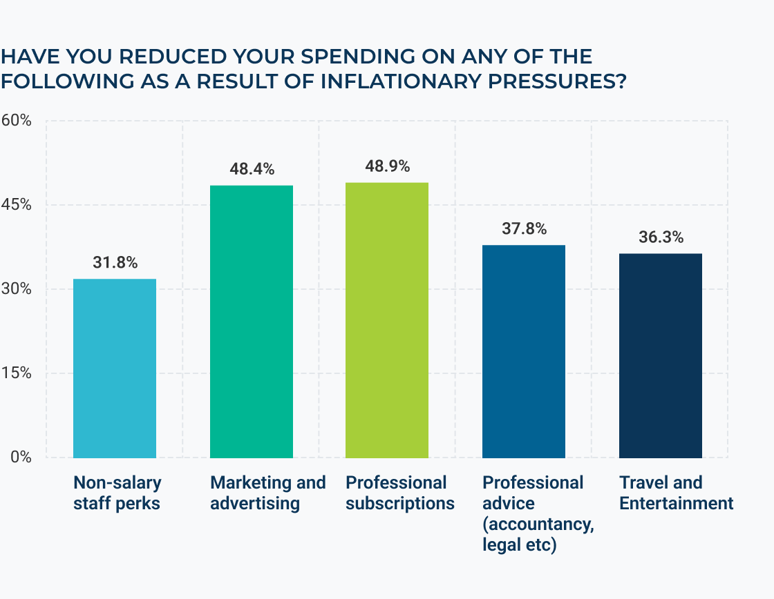 In response to mounting inflationary pressure nearly half of firms (49%) have reduced spend on professional subscriptions and 48% have reduced marketing and advertising outlays.